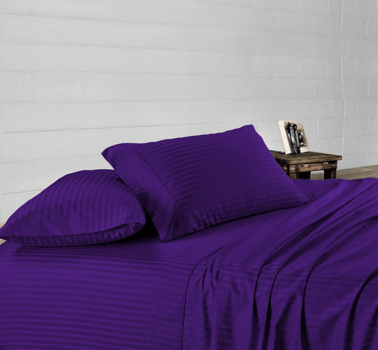 90% of people struggle to sleep because of rough and rigid sheets. This 4 Piece 600 TC Purple Stripe Waterbed Sheet set includes - 1 Fitted Sheet, 1 Flat Sheet, and 2 Luxury Pillowcases.