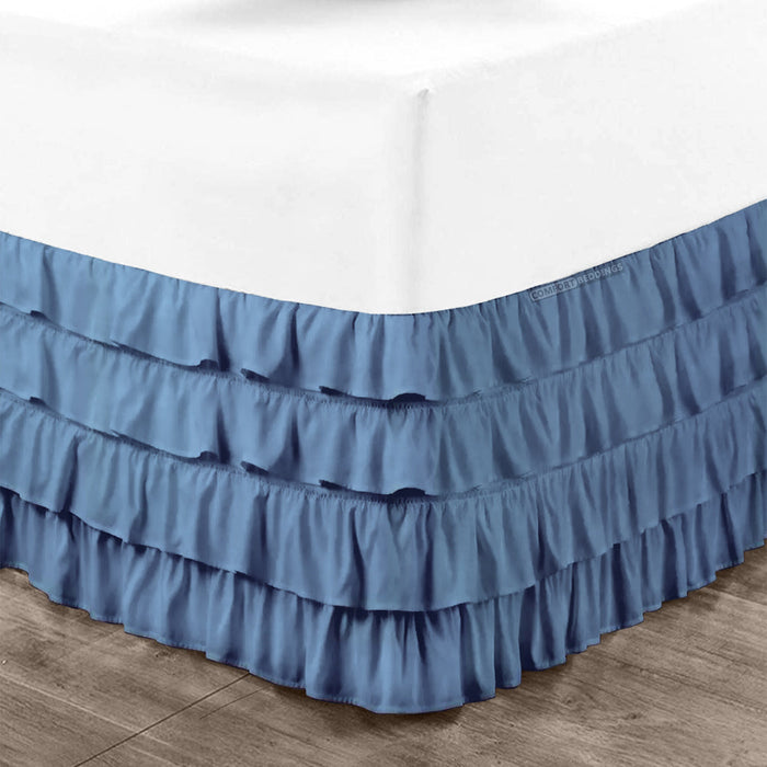 Ornament Your Suites Or Beds With Our Stylish Bed Skirts. Comfort Beddings offers the perfect finished Mediterranean blue waterfall ruffled bed skirt blended well with 100% microfiber. It is cautiously crafted to deliver your style, along with extra storage space at its best.