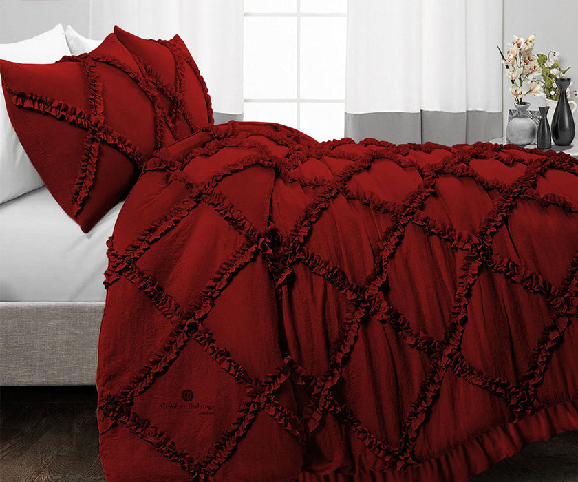 Comfort Beddings' cozy and comfortable Duvet Covers are made with the finest quality Egyptian cotton for the ultimate comfort experience. The Burgundy Diamond Ruffled Duvet Cover Sets are durable and last for years.