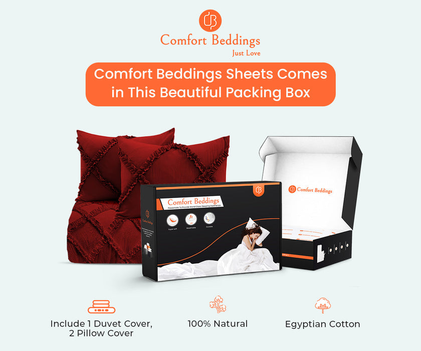 Comfort Beddings Burgundy Diamond Ruffled Duvet Cover set is a one-of-kind duvet cover set featuring 1 duvet cover and 2 pillow cases. This much-loved ruffled Duvet Cover set comes in a luxurious 600 and 1000 thread count woven with the highest quality Egyptian cotton for the highest comfort and lavishness.