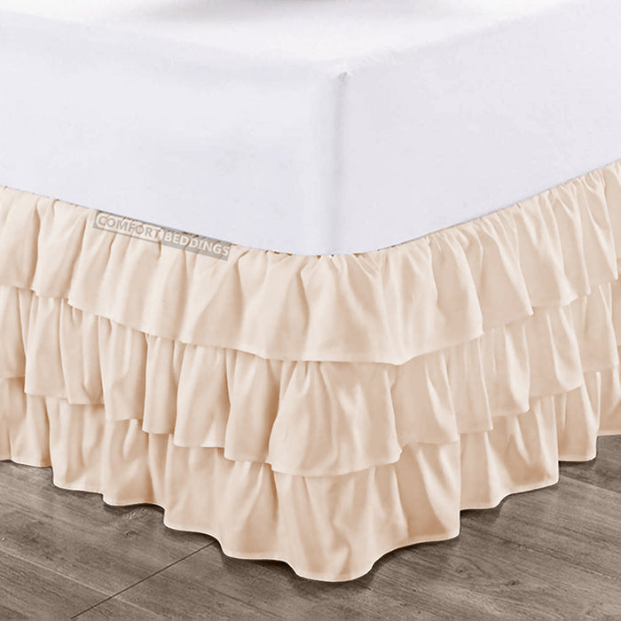 The whole bed skirt is made up of similar microfiber and cotton material, and we do not use lower-quality fabric for the base. We have Twin, King, and queen sizes available with us for our Peach Multi Ruffle Bed Skirt with various other color choices too, to choose from.