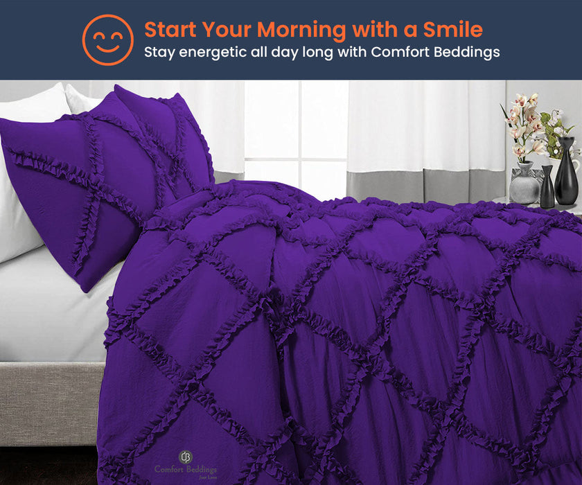 Comfort beddings cozy and comfortable Purple Diamond Ruffle Comforter is made with the finest excellent 100% Egyptian Cotton for the ultimate comfort experience with 250 GSM microfiber filling. This purple diamond ruffle Comforter is durable and lasts for years.